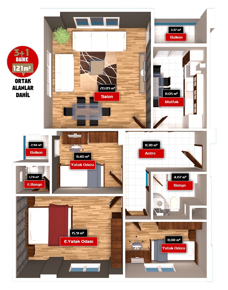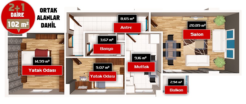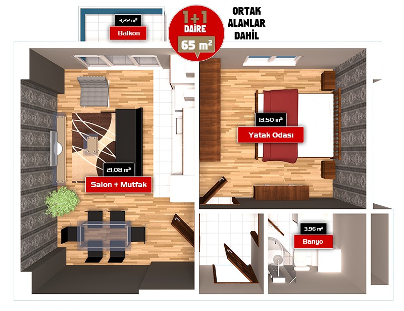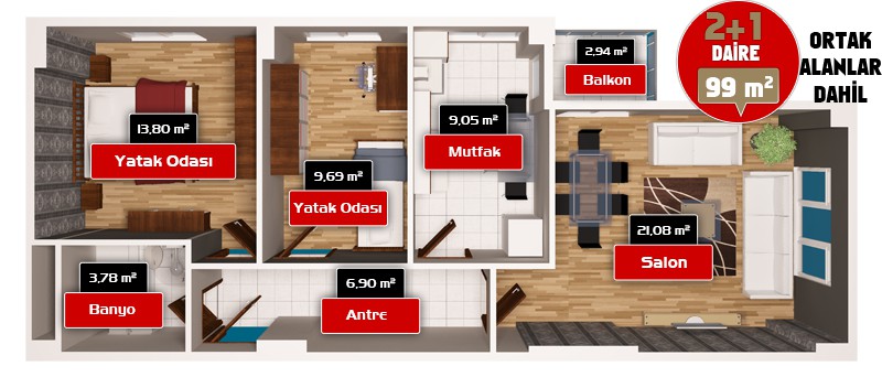 Daire Seçenekleri: 1+0,1+1,2+1,3+1